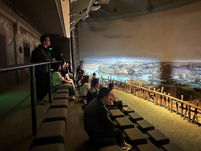 最后,各位党员观看了“阳澄烽火”半景画演示。1940年2月8日(大年初一),新“江抗”在阳澄湖畔利用水乡地形,以弱胜强,成功击退日伪军进攻,赢得了“洋沟溇战斗”的胜利。灯光暗下,逼真的场景细致还原了激烈的场景,带领大家穿越时空,重温苏州军民抗击日寇的峥嵘岁月。