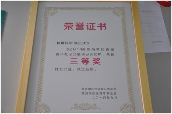 9月24日,由苏州高新区团委和苏州高新区青年联合会举办的“凝聚青春?公益共筑”首届青年社区公益项目设计比赛在苏州高新区管委会举行。比赛共设一等奖一名,二等奖两名,三等奖三名。苏州医工所“传播科学 促进成长”青年志愿服务项目最终获得三等奖。 经过前期层层筛选,共有10支青年社区公益创意团队凭借着各具特色的项目晋级到最终评比环节。这些项目涵盖了青少年自护关爱、科普教育、国防宣传、安全知识普及、尊老爱老等多个方面,集中展示了青年公益组织服务社区的思路和创意。 苏州医工所“传播科学 促进成长”青年志愿服务项目,充分发挥了科研院所独特的科技和人才优势。自2014年3月组建科学传播志愿者协会以来,通过科普知识讲座和成长励志讲座,通过“走出去”和“迎进来”两种形式。带领中、小学生走近科学、感受科学,掌握科学知识和科学方法,促进中、小学生树立远大抱负,并在学习生活中发愤图强、不懈努力,努力实现个人理想和奋斗目标。目前,已经进行了两次小规模的志愿服务活动,近期还将组织一次较大规模的“迎进来”活动。